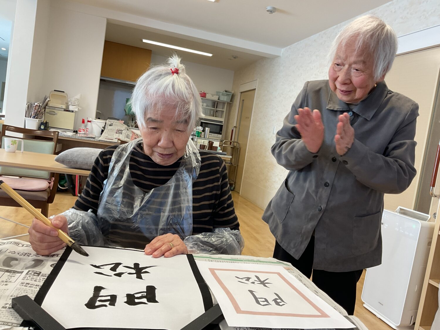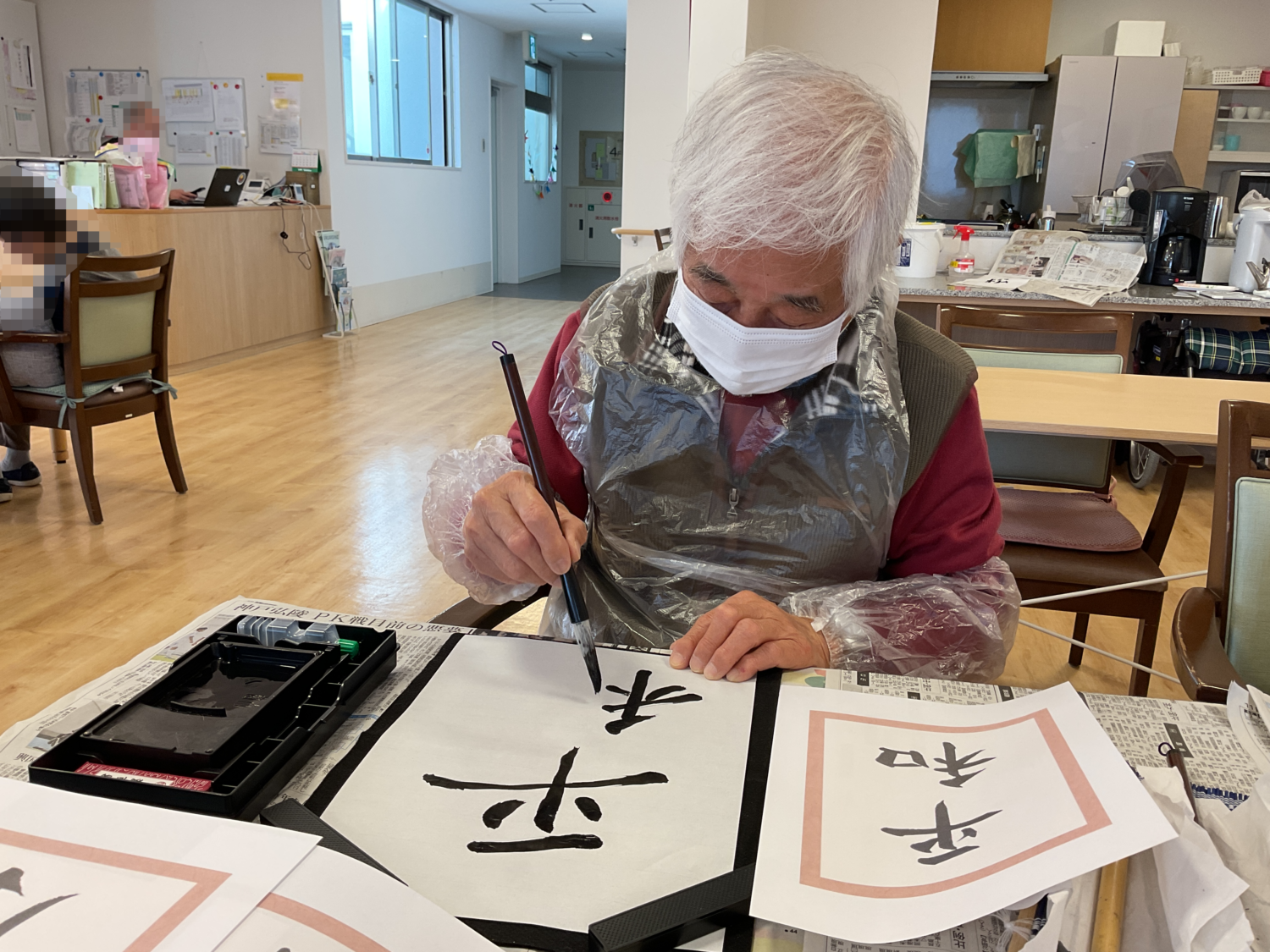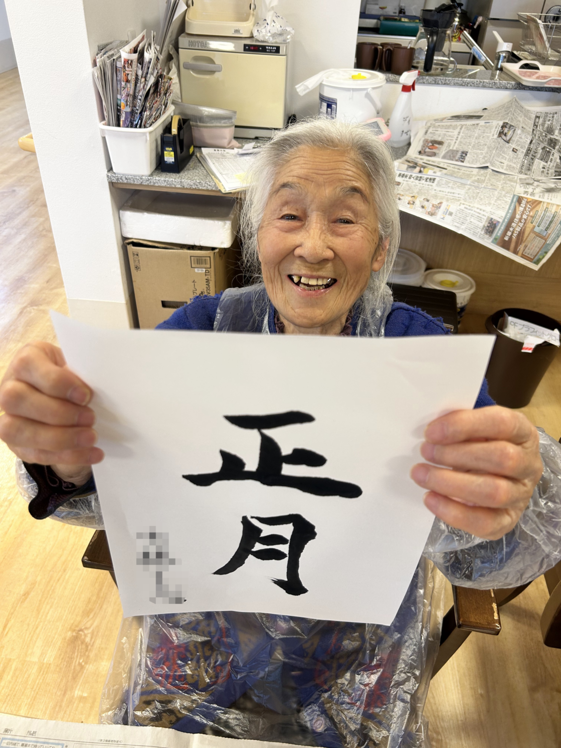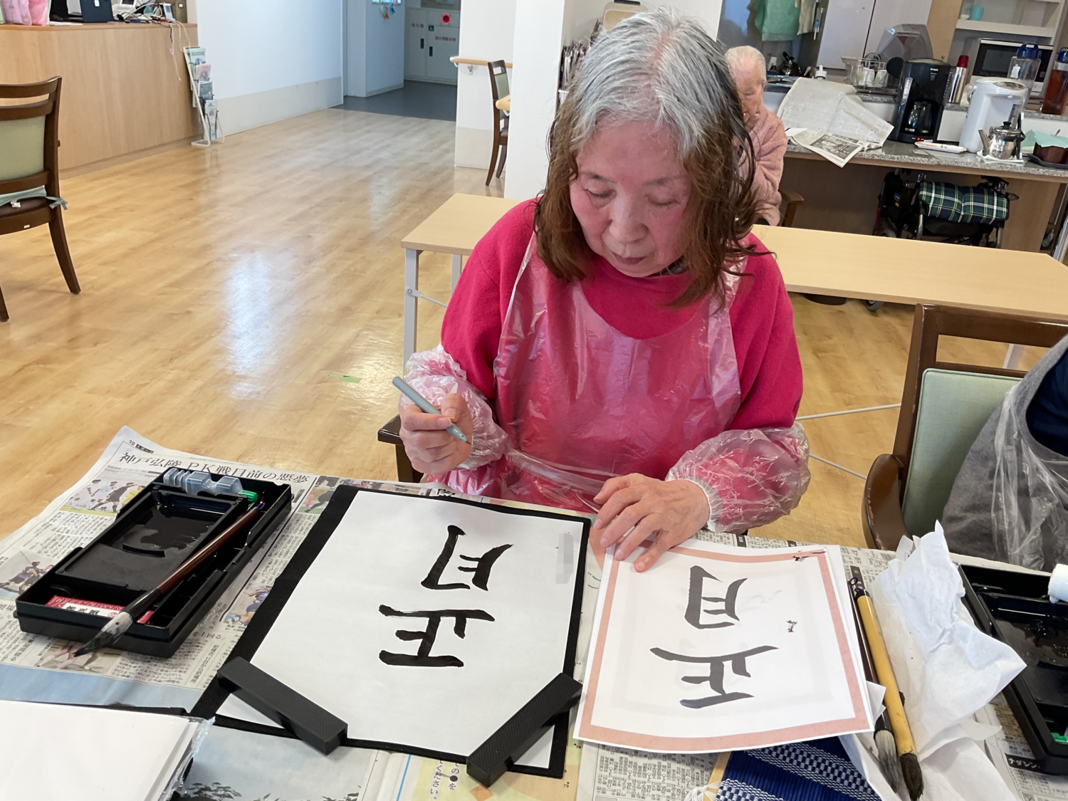 筆を持つと自然と集中され、「正月」「一月」「平和」など、それぞれ思いを込めて丁寧に書いておられました。