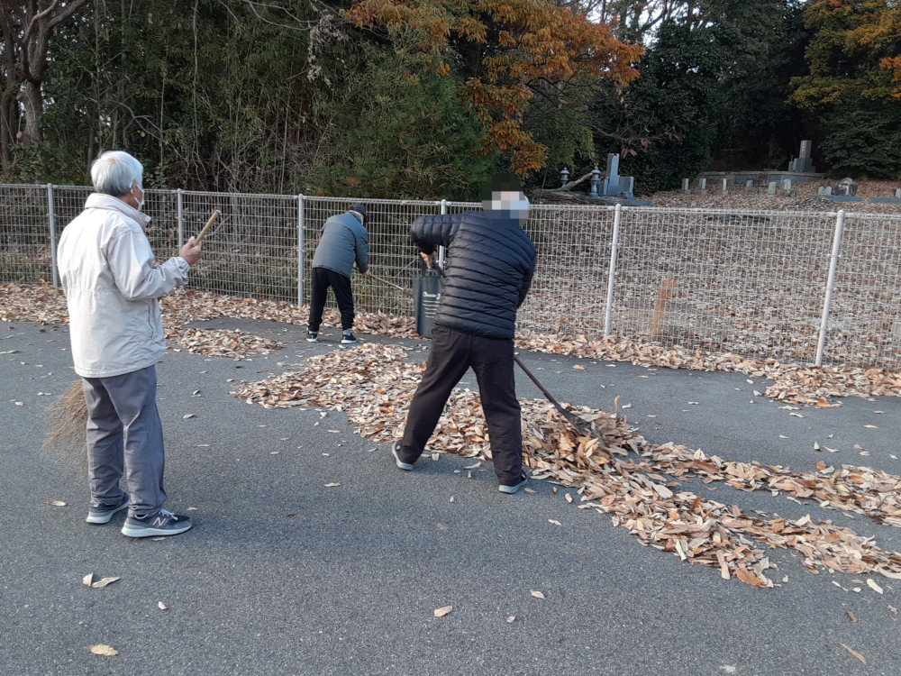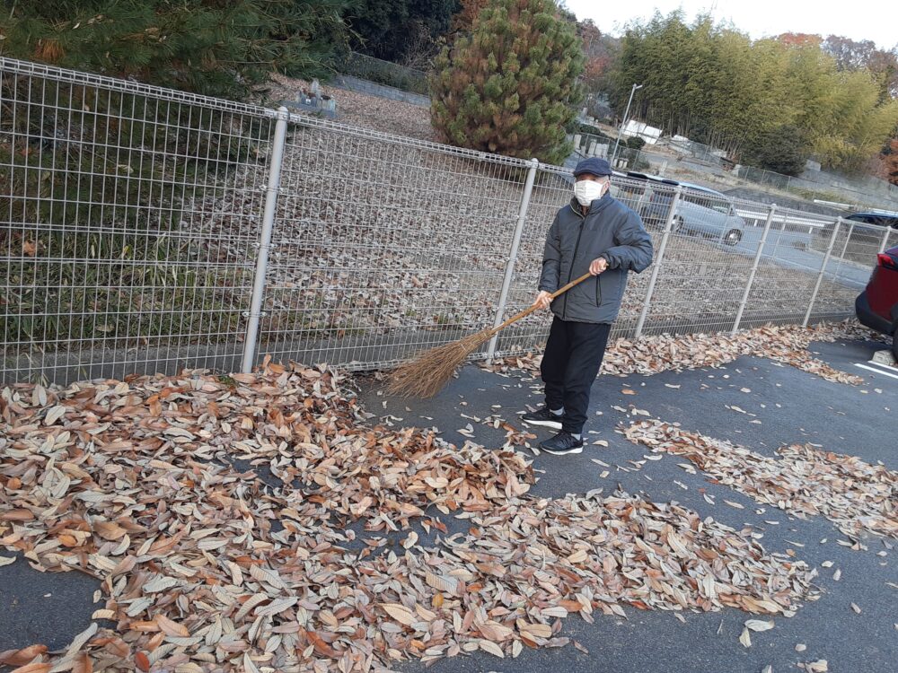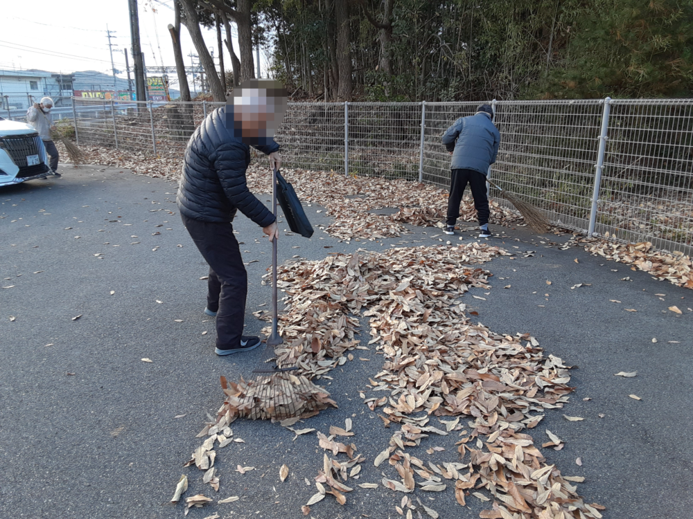 熊手やほうきを使い、落ち葉を一つひとつ丁寧に集めてくださり、駐車場がすっきりときれいになりました。